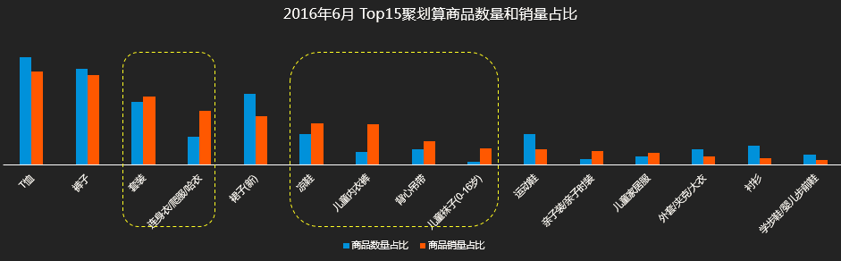 在6月参聚的商品中,销量排名前五的产品占比总销量超过了六成,对比商品的投放量,我们发现,套装和连身衣商品投放数量占比要小于商品销量占比;在夏季的机会产品中,凉鞋、儿童内衣裤、背心吊带和儿童袜子等产品的投放数量占比大幅小于商品销量占比。由此可见,这些商品的存在较大的供需错配,商家在参聚时,可以适当加大投放或是将投放重心放到这些品类上,以满足消费者对其的需求。