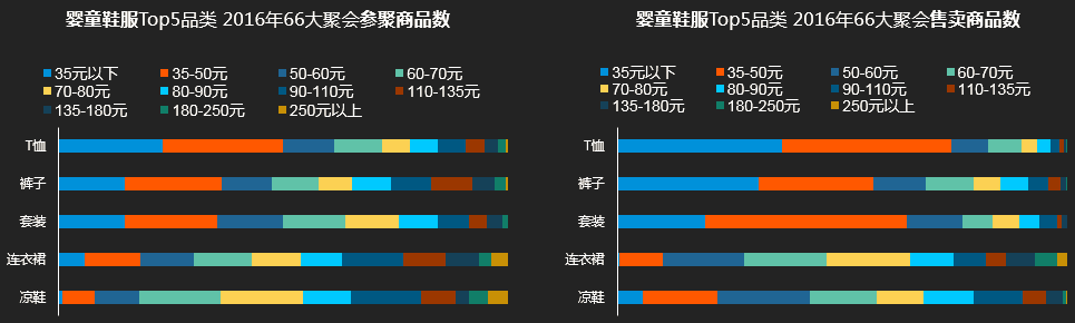 在参聚产品中,销量仍集中在低价格段上。在销量TOP3的产品中,50元以下价格段的销量占比总销量均超过了50%,而该价格段的产品参聚数量占比明显偏低,商家可有针对性的调整参聚商品的价格段,以满足市场的需求。在连衣裙和凉鞋品类则是50-80元和35-60元区间内的产品需求量最大。