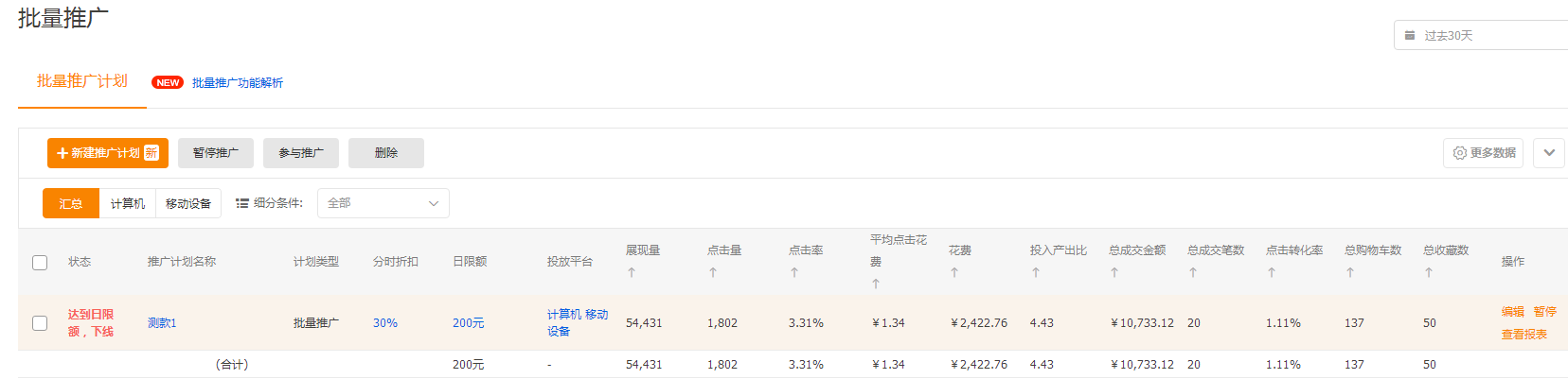 4、设置完之后,价格由系统自动出价,出价策略可以选择测款和平销。以下是最近30天的操作数据。