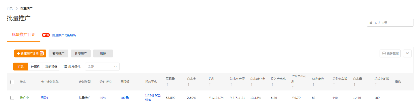 批量推广是直通车为卖家提供的智能化推广功能,只需进行简单的计划设置,即可开始直通车推广。系统将根据您选择的宝贝为您匹配海量高品质流量,同时支持单宝贝智能投放和多宝贝快捷推广,满足日常销售、新品测款和活动引爆的不同需求!